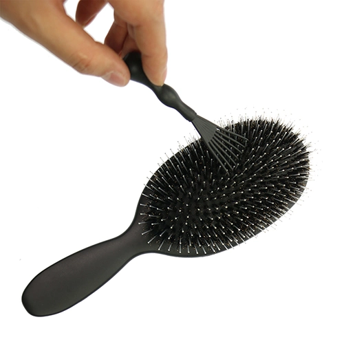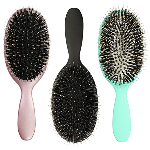 Soft-touch rubber-coated cushion brush with boar bristles for smooth, shiny hair and gentle scalp massage. Anti-slip design, professional quality. Available in custom colors and branding.