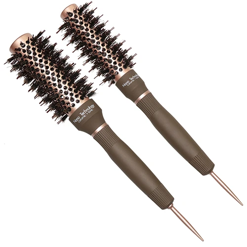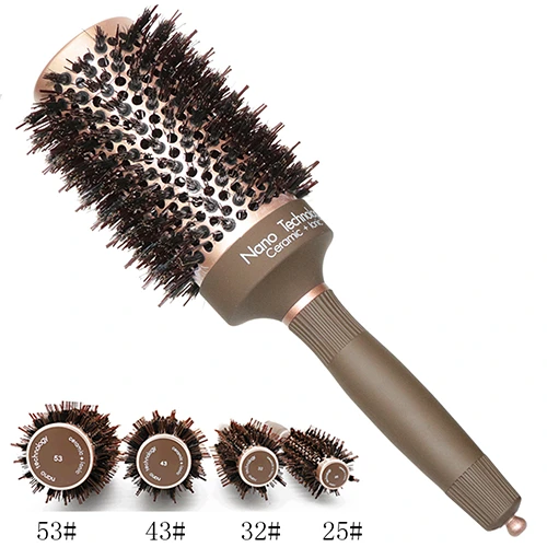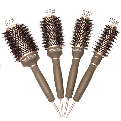 Professionell brun rund hårborste med borst av vildsvin och nylon. Designad för mjuka blowouts, detangling och volymstyling på alla hårtyper. Perfekt för salong eller hemmabruk.